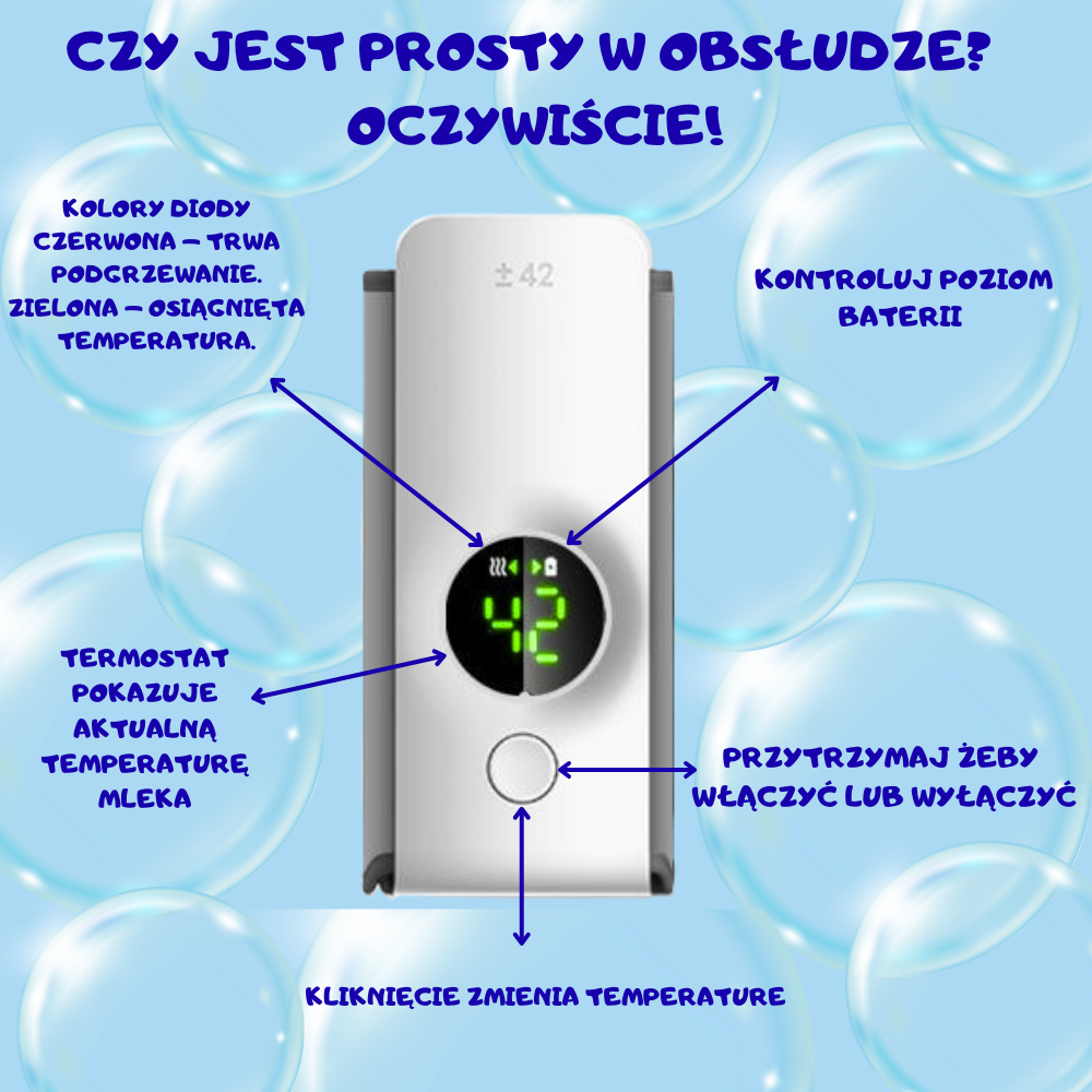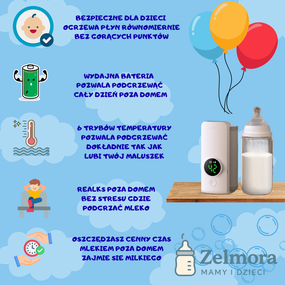 6000 mAh baterii pozwala na jednym ładowaniu podgrzewać mleko non stop nawet do 6h